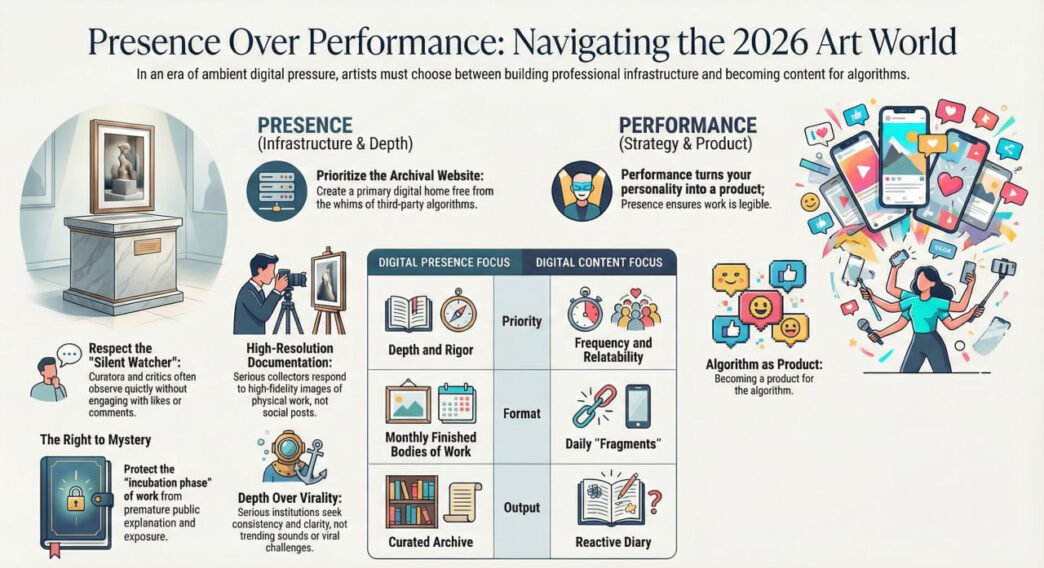In the art world of 2026, visibility is no longer a luxury; it is a constant, ambient pressure. Artists are bombarded with advice to “post regularly,” “reveal vulnerability,” and “optimize for engagement.” The underlying fear is subtle but paralyzing: If you are not visible, you are disappearing.