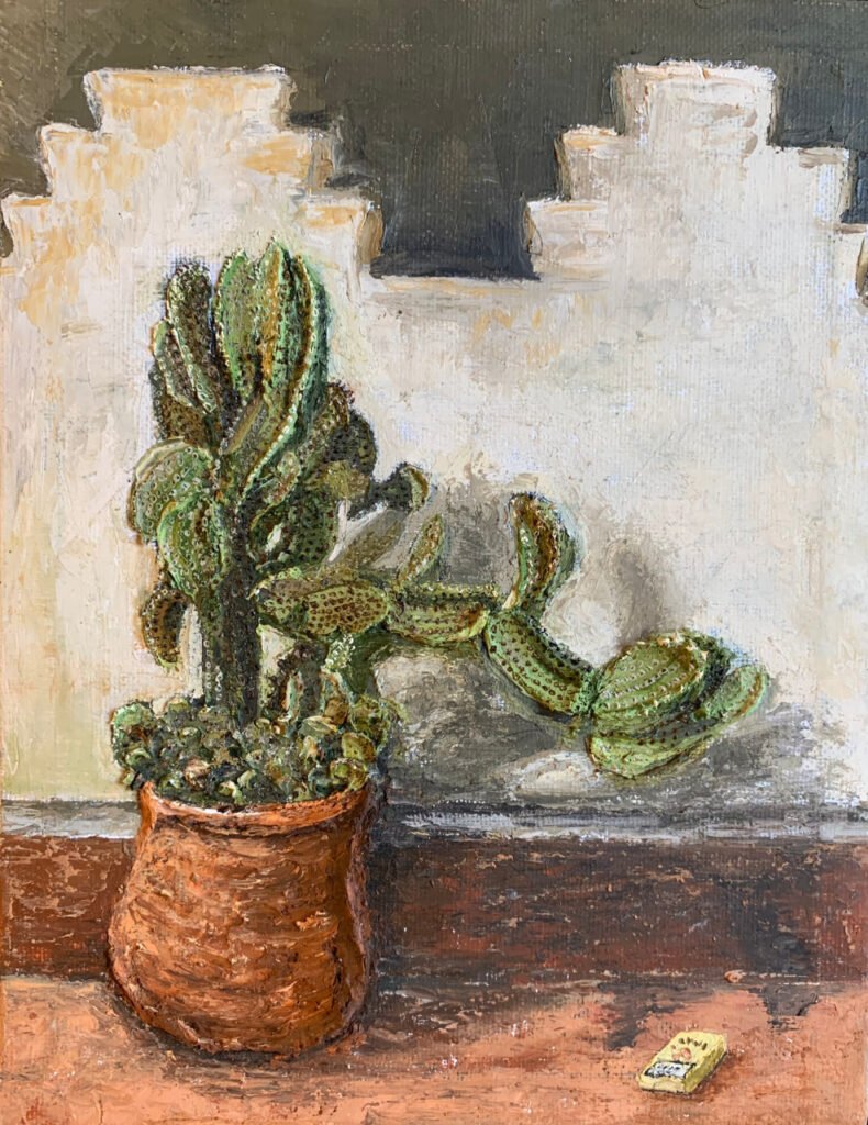 Phoenix Hudson @phoenixhudsonart “Cactus at night, camels delight”  – oil on canvas, (18 x 23cm) 2026