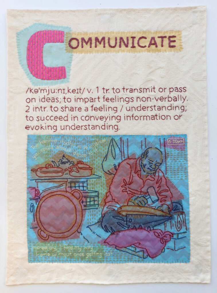 Lynne Chapman @lynnepencil “Fez Metalworker” – hand-embroidery and organza layers on cotton – 2026